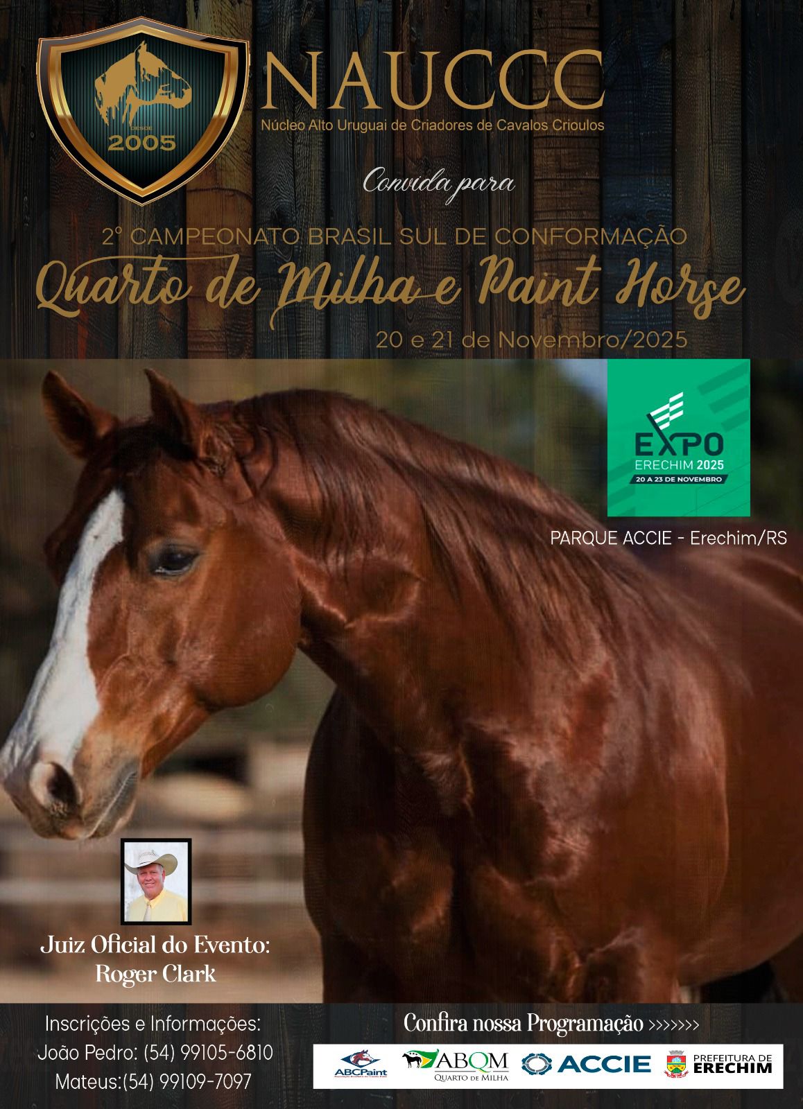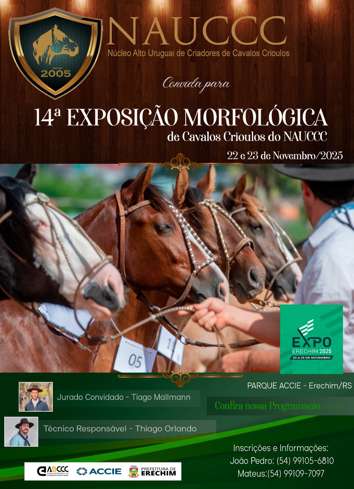 Entre os dias 22 e 23 de novembro, a Expo Erechim sediará a 14ª Exposição Morfológica de Cavalos Crioulos do NAUCCC, evento oficial que reúne criadores e expositores de diferentes municípios do Rio Grande do Sul. A atividade ocorrerá na Arena Cultural e contará com a participação do jurado convidado Tiago Mallmann e do técnico responsável Tiago Orlando.