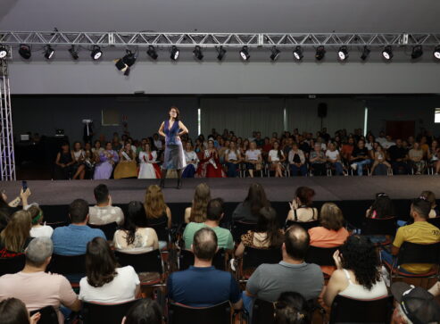 Na sequência, as formandas do curso de Tecnologia em Design de Moda apresentaram suas coleções finais, desenvolvidas a partir do tema “tempo”. As produções buscaram o equilíbrio entre passado, presente e futuro, propondo uma moda que desacelera, resgata memórias e conecta origens e inovação.