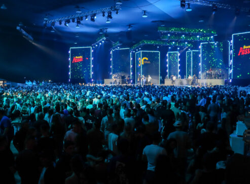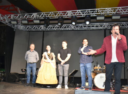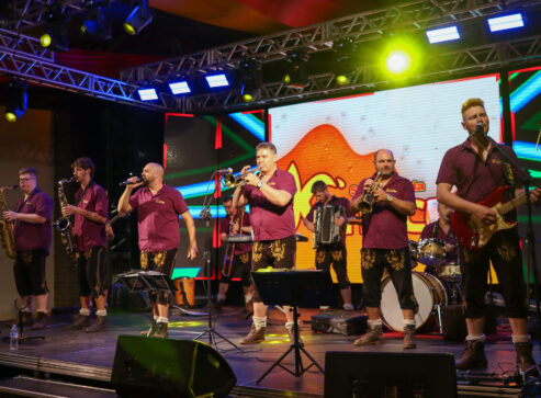 Logo após a solenidade de abertura, a Banda K’necus subiu ao palco e deu início à festa, contagiando o público com seu repertório vibrante. A plateia respondeu com entusiasmo, dançando e cantando ao som de sucessos que embalaram a primeira noite da Oktoberfest.