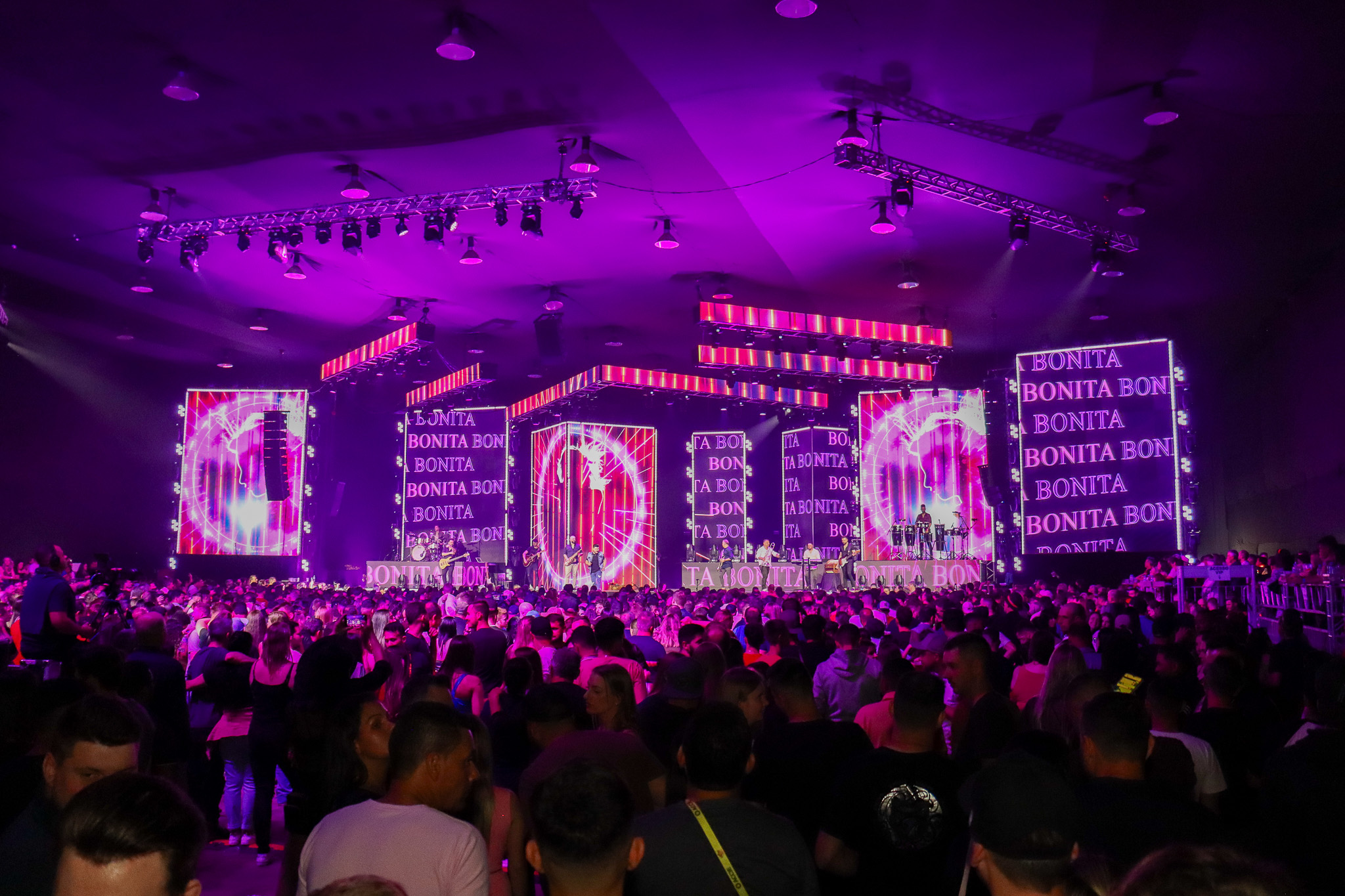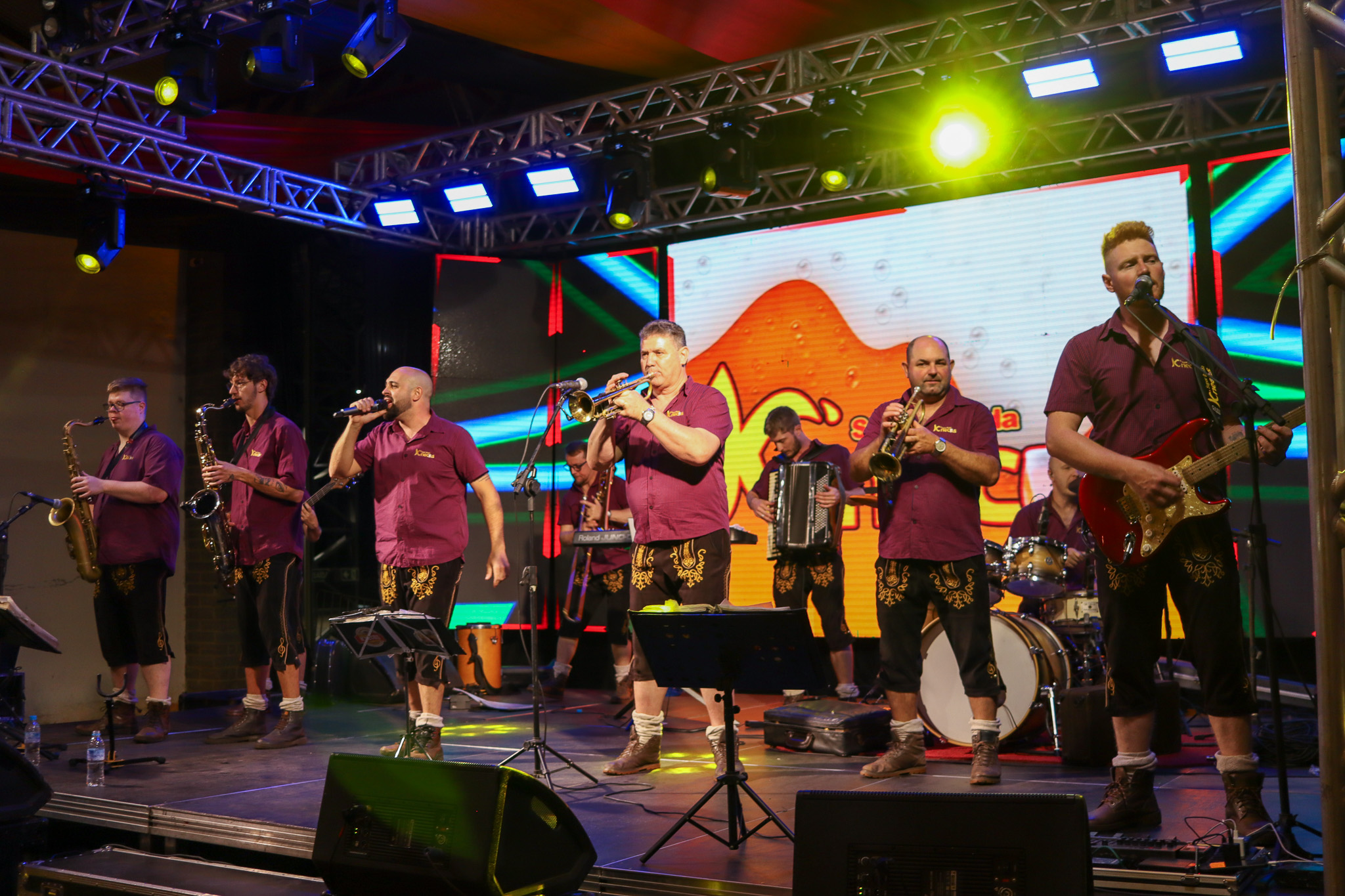 Logo após a solenidade de abertura, a Banda K’necus subiu ao palco e deu início à festa, contagiando o público com seu repertório vibrante. A plateia respondeu com entusiasmo, dançando e cantando ao som de sucessos que embalaram a primeira noite da Oktoberfest.